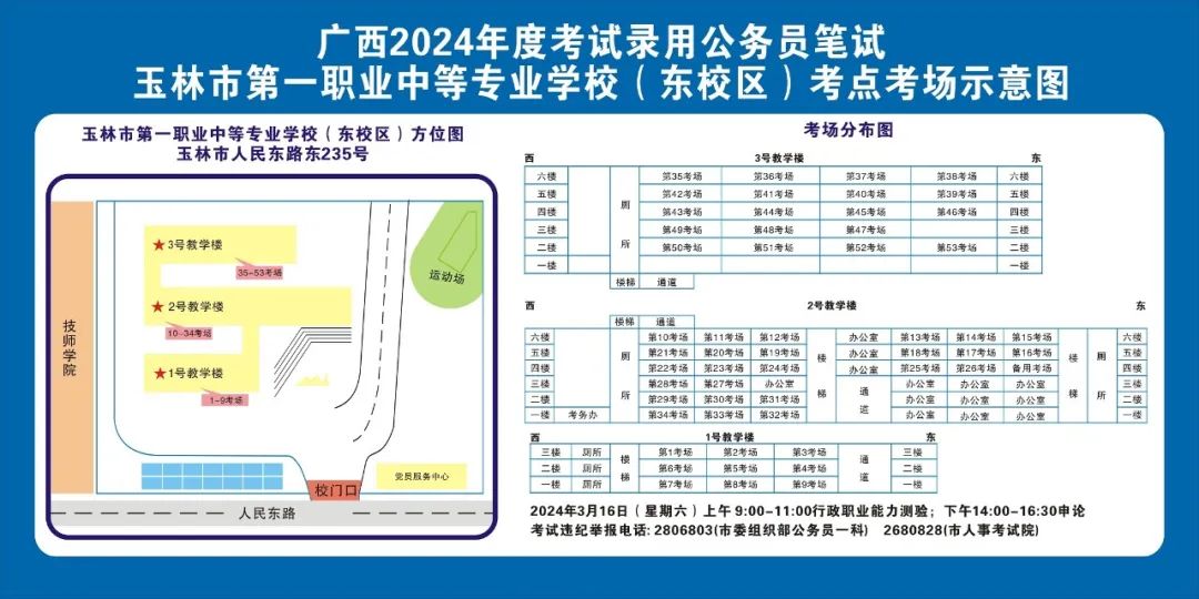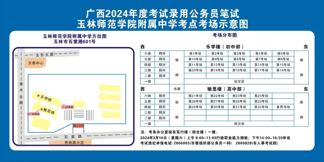 除考試當(dāng)天考生可以進入考點外,考生不得提前進入考點查看考場(學(xué)校將在大門處擺放考場分布示意圖),玉林考區(qū)10個考點的考場布置情況如下: