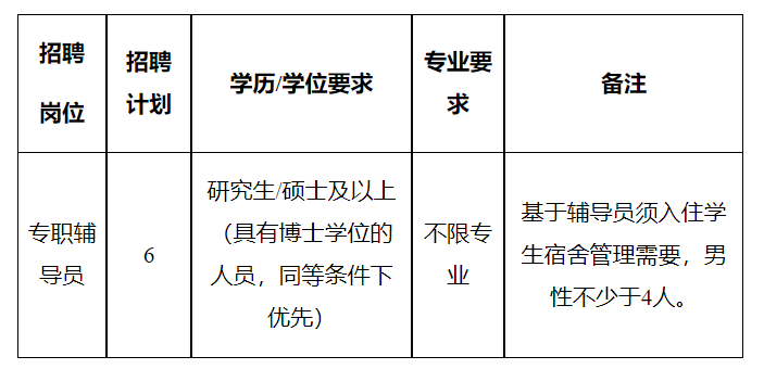 (四)年齡不超過(guò)30周歲,即1993年12月1日及之后出生;具有博士學(xué)位的,或具有高級(jí)職稱(chēng)的,或有專(zhuān)職輔導(dǎo)員工作經(jīng)驗(yàn)且在各類(lèi)輔導(dǎo)員職業(yè)能力競(jìng)賽、輔導(dǎo)員評(píng)優(yōu)評(píng)先等活動(dòng)中獲得過(guò)省部級(jí)(含)以上獎(jiǎng)勵(lì)表彰者,年齡可放寬至35周歲,即1988年12月1日及之后出生。