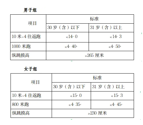 參照《關(guān)于印發(fā)公安機關(guān)錄用人民警察體能測評項目和標準(暫行)的通知》(人社部發(fā)〔2011〕48號)的項目及測試規(guī)則,結(jié)合《公安民警體育鍛煉達標手冊》成績標準,本次體能測評的項目和標準如下: