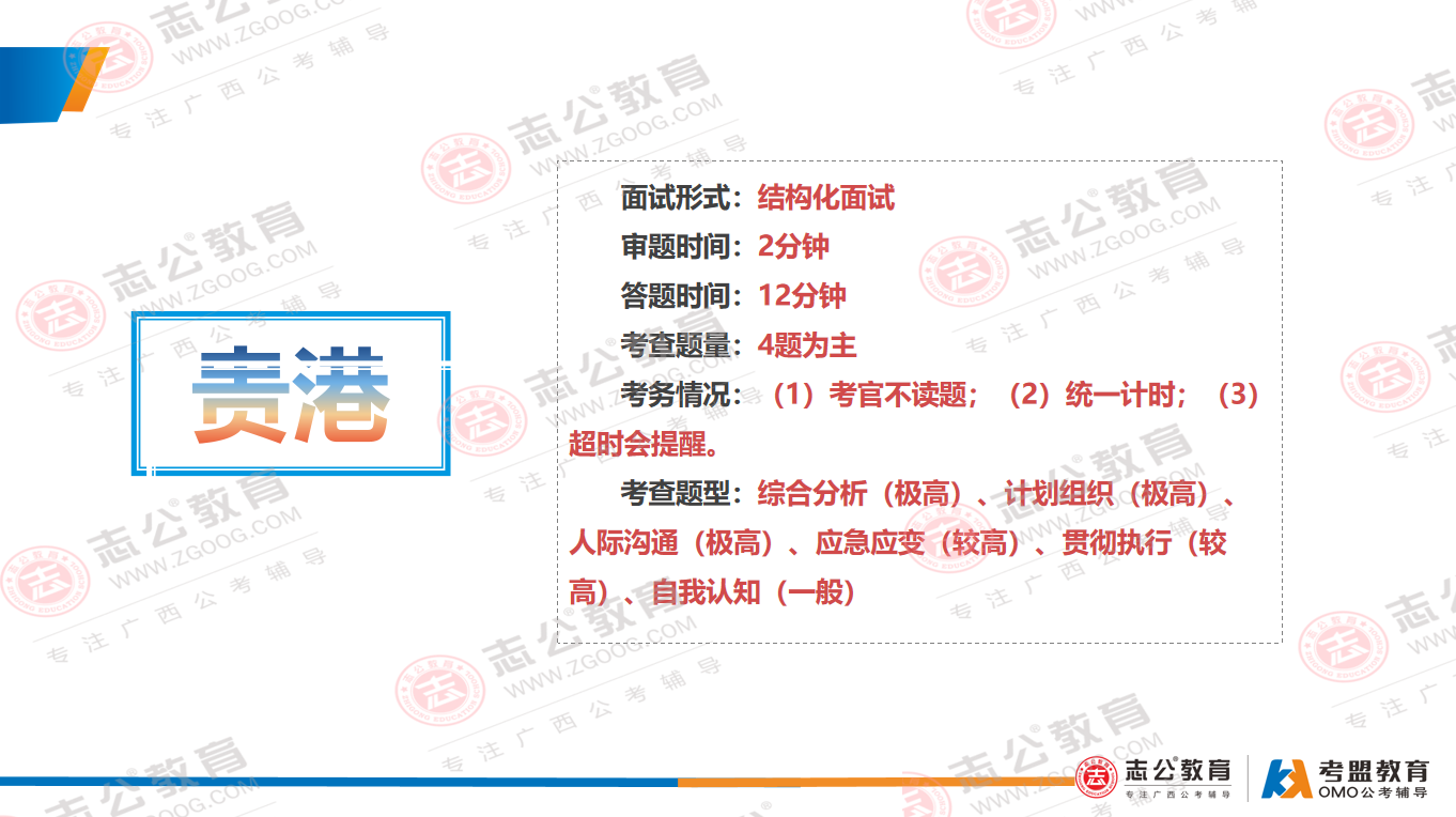 貴港事業(yè)單位面試主要采用結(jié)構(gòu)化面試形式;審題時間:2分鐘;答題時間:12分鐘;考查題量:4題為主??紕?wù)情況:考官不讀題、統(tǒng)一計時、超時會提醒??疾轭}型:綜合分析(極高)、計劃組織(極高)、人際溝通(極高)、應(yīng)急應(yīng)變(較高)、貫徹執(zhí)行(較高)、自我認(rèn)知(一般)。