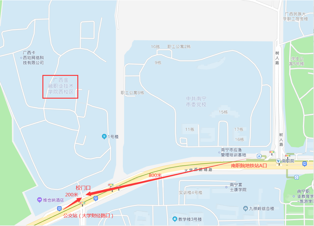 學(xué)校位于南寧市西鄉(xiāng)塘區(qū)大學(xué)西路168號(hào),可乘坐公交車103路、807路大學(xué)財(cái)經(jīng)路口下,或乘坐地鐵1號(hào)線到“南職院”站A口出站(如圖所示)。