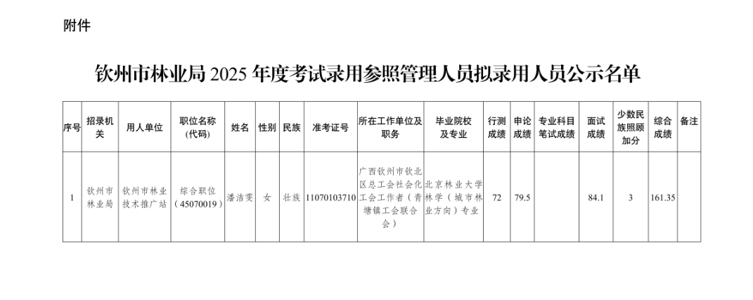 附件:欽州市林業(yè)局2025年度考試錄用參照管理人員擬錄用人員公示名單