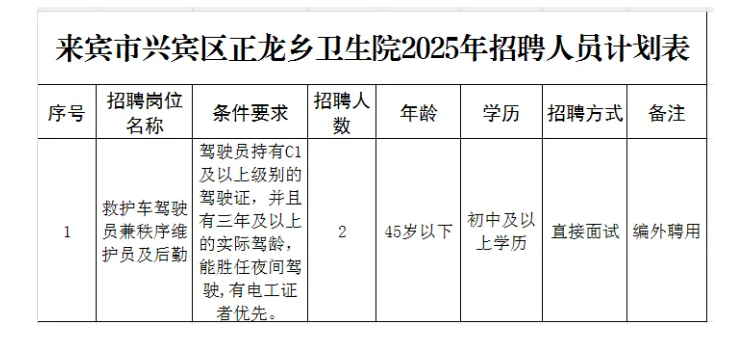 來賓市興賓區(qū)正龍鄉(xiāng)衛(wèi)生院2025開招聘非醫(yī)學(xué)類編外工作人員2人