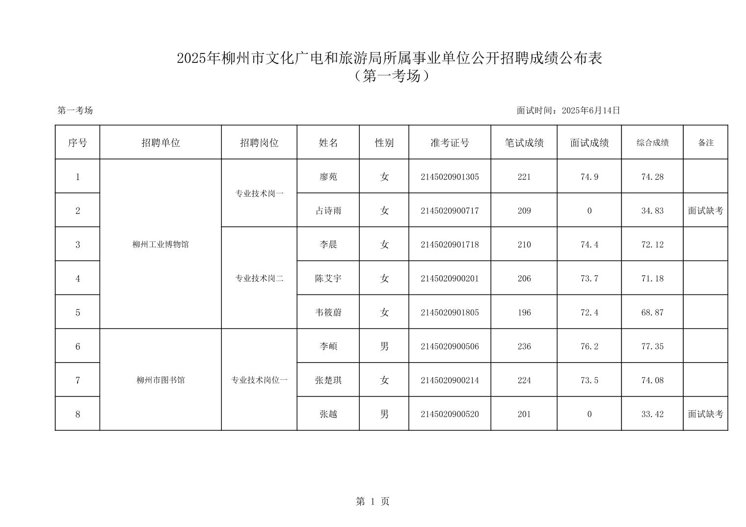 2025年柳州市文化廣電和旅游局所屬事業(yè)單位公開(kāi)招聘成績(jī)公布表