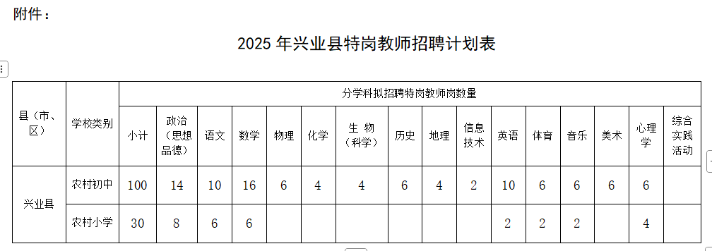 附件: 2025年興業(yè)縣特崗教師招聘計(jì)劃表