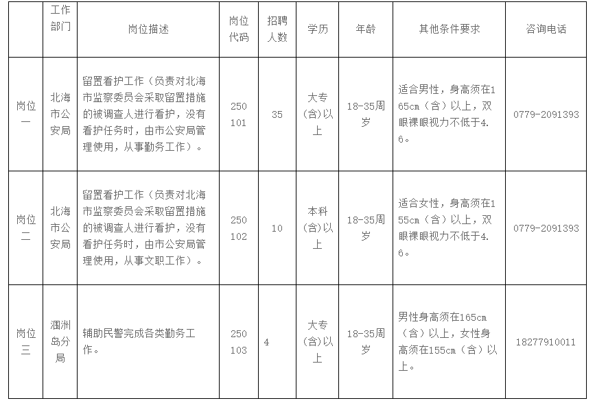 有關(guān)招聘信息,應聘人員可登錄北海市人才網(wǎng)(www.bhrc.cn)、北海市公安局微信公眾號“北海公安”查詢。咨詢報考崗位、資格條件等信息,可在工作時間內(nèi)致電各崗位咨詢電話。
