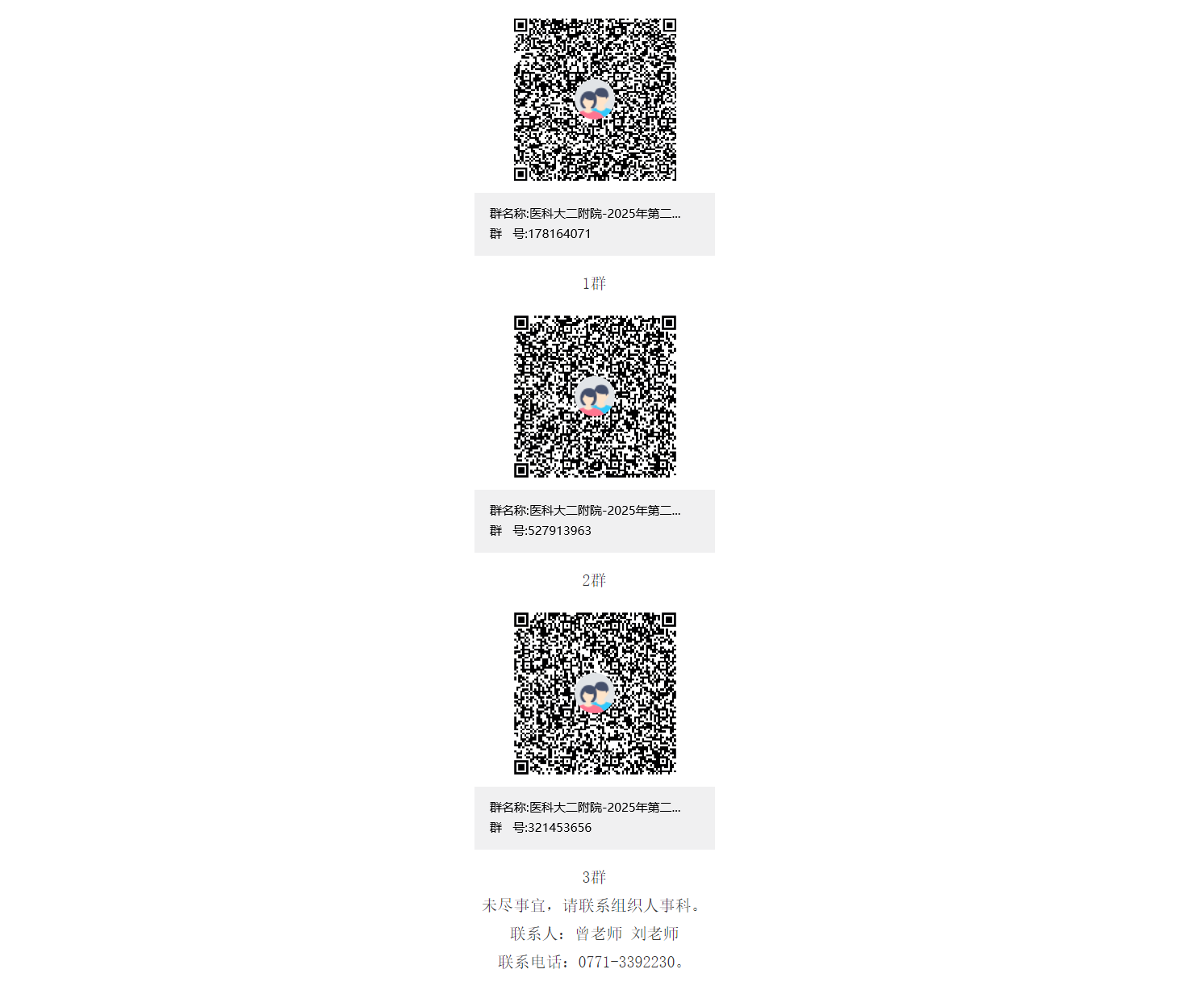考核與面試的時間、地點另行通知,擇優(yōu)聘用。通過資格審核的考生名單及相關(guān)考試事宜將在“醫(yī)科大二附院-2025年第二批醫(yī)技藥行政招聘群”發(fā)布,請應聘者務必進群并關(guān)注群消息,不再另行通知。請通過搜索群號碼(1群:178164071、2群:527913963、3群:321453656)或掃碼加群(1群滿后請加2群、3群):