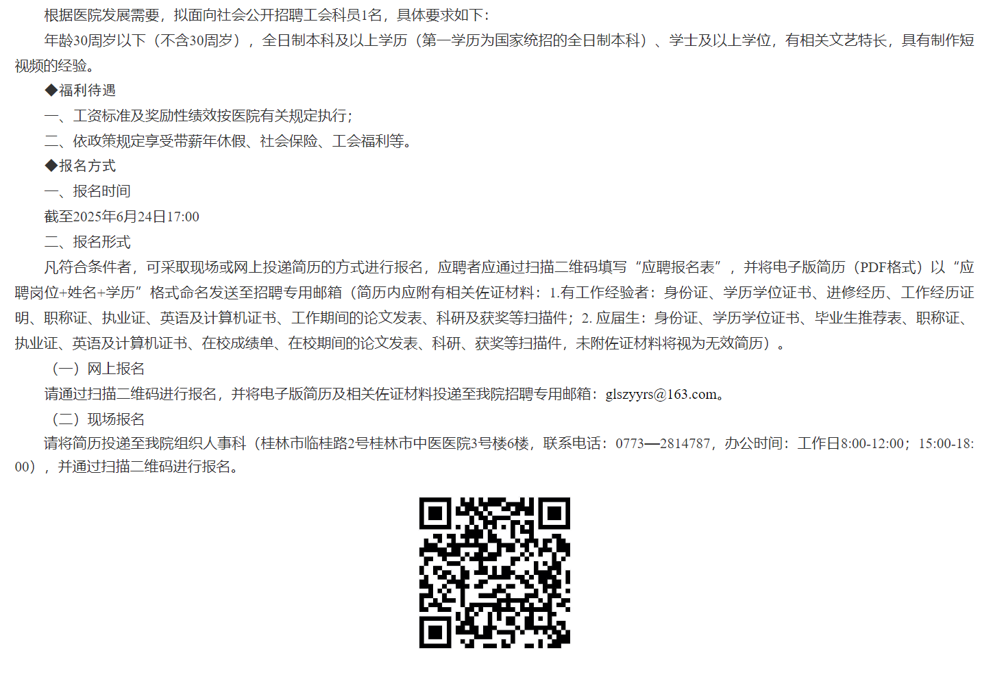 2025年桂林市中醫(yī)醫(yī)院工會(huì)科員招聘1人