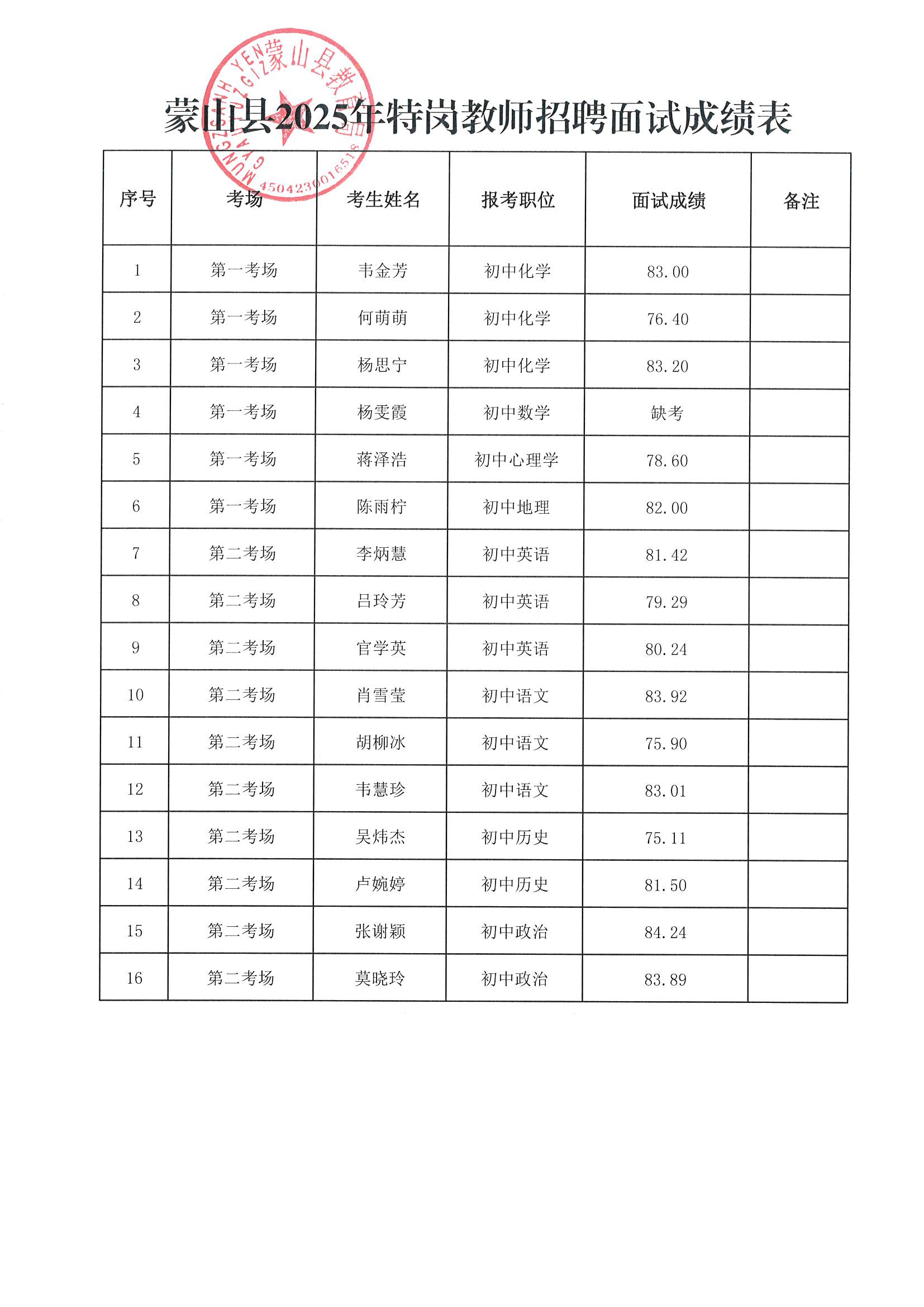 蒙山縣2025年特崗教師招聘面試成績公告