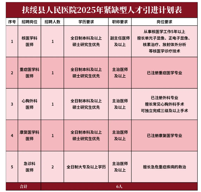 為進(jìn)一步充實(shí)現(xiàn)有人才隊(duì)伍,促進(jìn)醫(yī)院學(xué)科發(fā)展,提升醫(yī)院綜合實(shí)力,結(jié)合醫(yī)院實(shí)際工作需要,扶綏縣人民醫(yī)院決定面向社會進(jìn)行公開招聘各類醫(yī)學(xué)人才,具體招聘事宜如下: