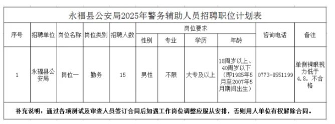 計劃招聘警務輔助人員15名。具體崗位、招聘人數、資格條件詳見《永福縣公安局輔警招聘計劃表》。