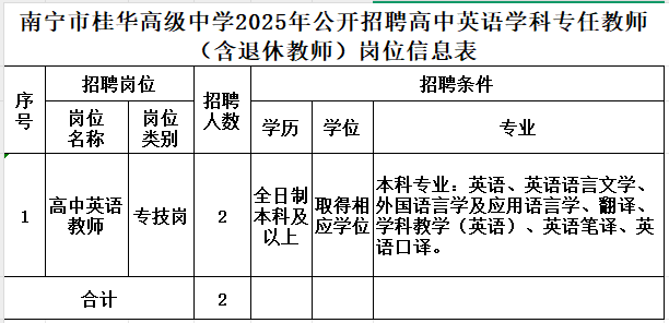 2025年南寧市桂華高級中學(xué)公開招聘2名高中英語專任教師(含退休教師)的公告
