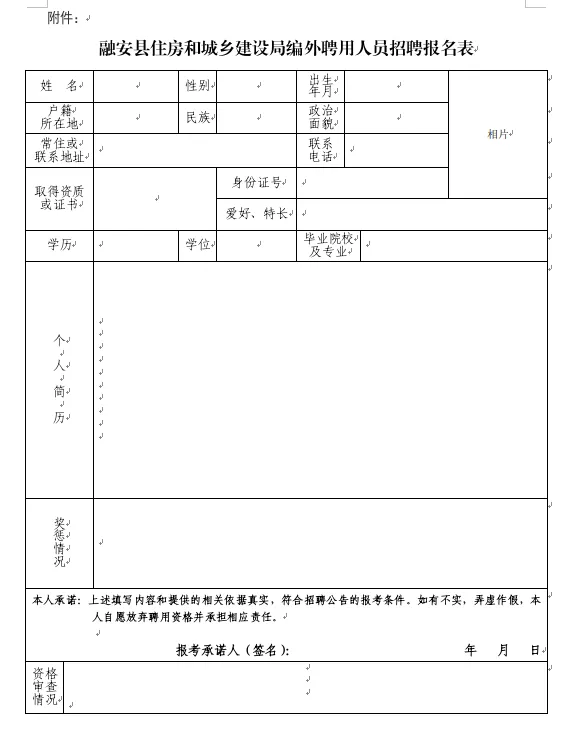 (1)報名方式:應(yīng)聘者將報名表等相關(guān)材料發(fā)送至融安縣住建局郵箱:raxjsj@163.com,報名材料主要包括:報名表(請自行下載填寫,并手寫簽名)、身份證、學(xué)歷學(xué)位證書、資格證書、獲獎證書等。以上材料均需掃描成PDF版本。