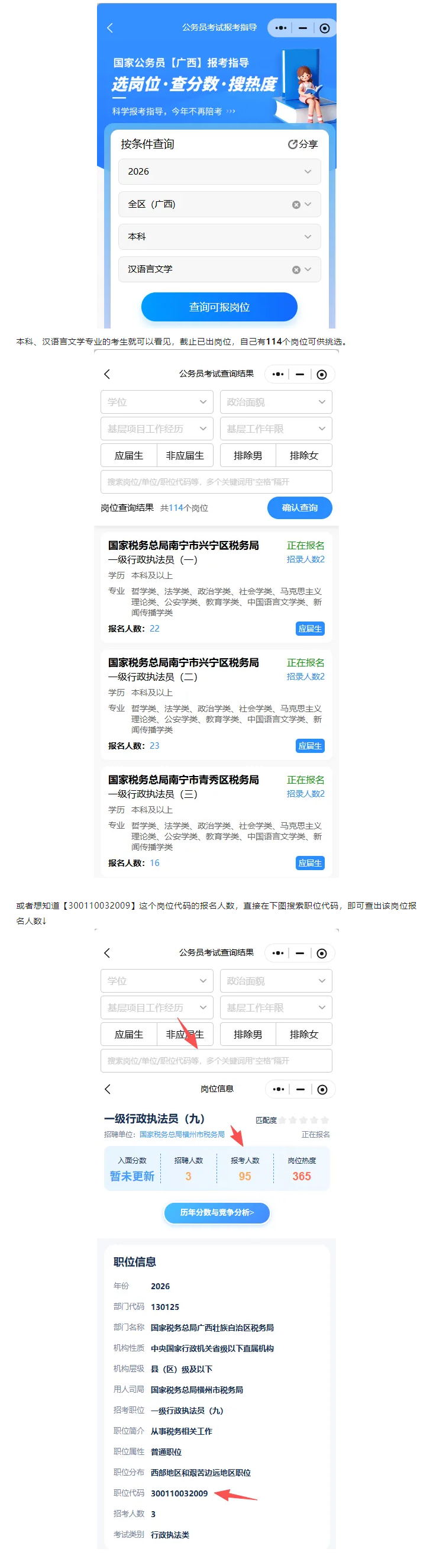 因?yàn)槭翘幱趪歼x崗階段,我們更想知道選崗功能,思路是【選擇學(xué)歷】-【選擇專業(yè)】/輸入崗位代碼即可看見想查看的崗位,自己查看可以報(bào)名的大致崗位范圍及具體崗位的報(bào)名人數(shù),下面以2026年國考(廣西)崗位為例,比如,你是本科、漢語言文學(xué)專業(yè)的考生,選擇學(xué)歷-【本科】輸入【漢語言文學(xué)】選擇彈出來的分類目錄。