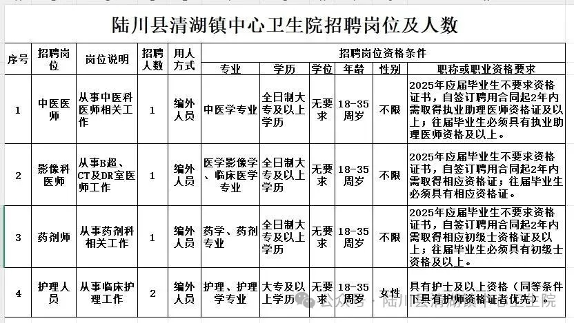 2025玉林陸川縣清湖鎮(zhèn)中心衛(wèi)生院發(fā)布公開招聘編外人員5人