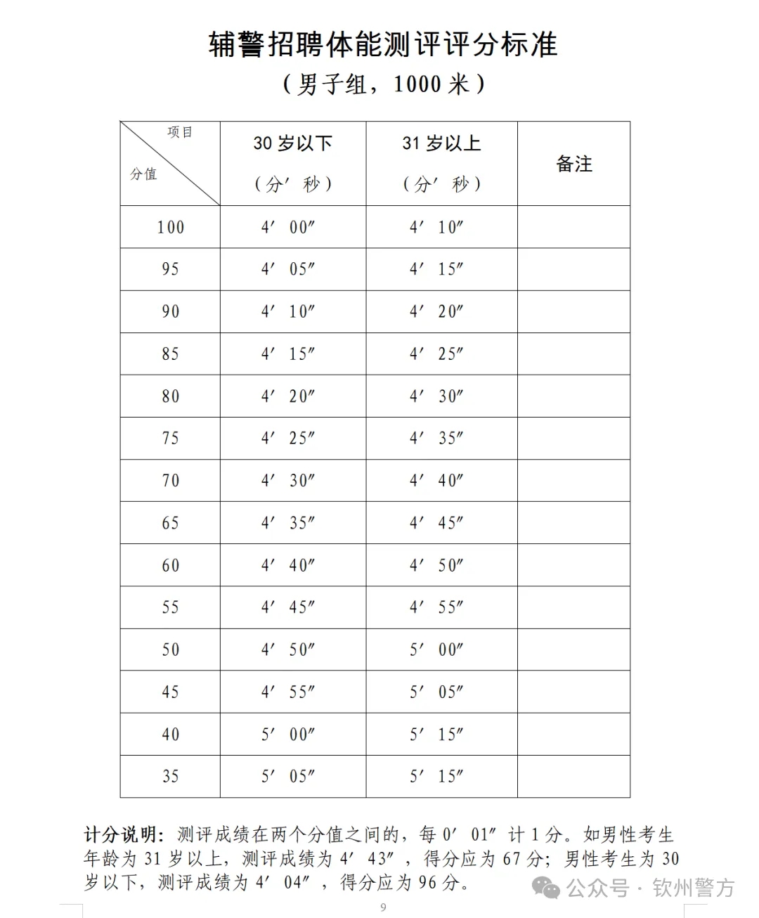 1.體能測試。資格審查合格的考生參加體能測試。體能測試項(xiàng)目為長跑,即男子1000米,體能測試計算成績,評分標(biāo)準(zhǔn)附后。
