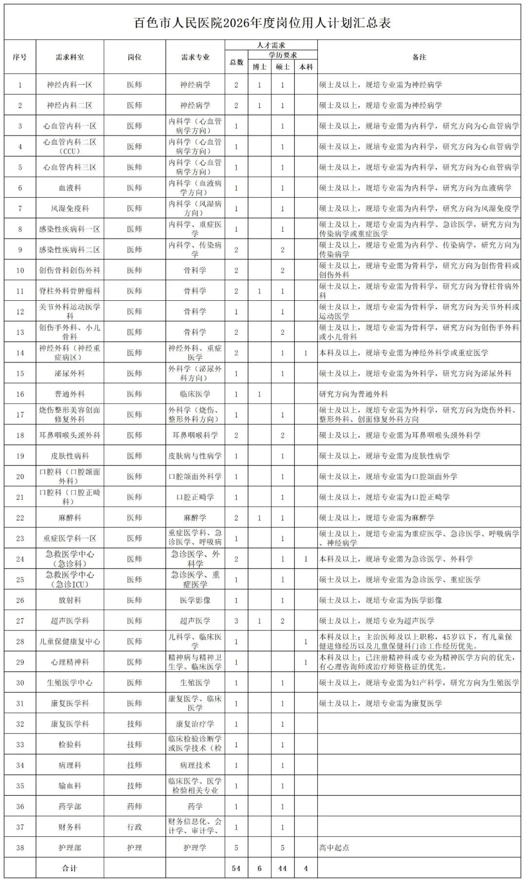 為進(jìn)一步加強(qiáng)醫(yī)院人才隊(duì)伍建設(shè),提升醫(yī)療服務(wù)能力,百色市人民醫(yī)院現(xiàn)面向社會(huì)公開(kāi)招聘醫(yī)師、醫(yī)技及護(hù)理等崗位專業(yè)技術(shù)人才54人,具體如下: