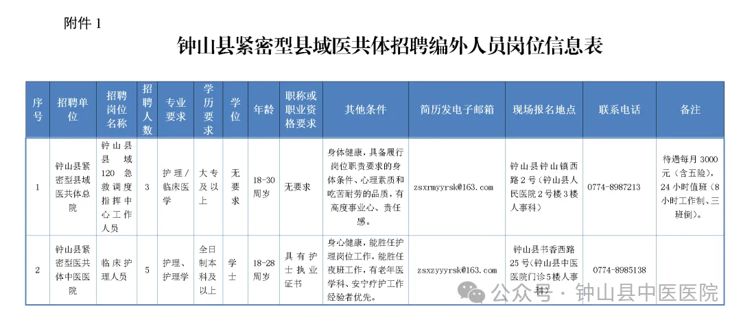 5.崗位具體信息及要求詳見附件1《鐘山縣緊密型縣域醫(yī)共體招聘編外人員崗位信息表》(如下圖)。