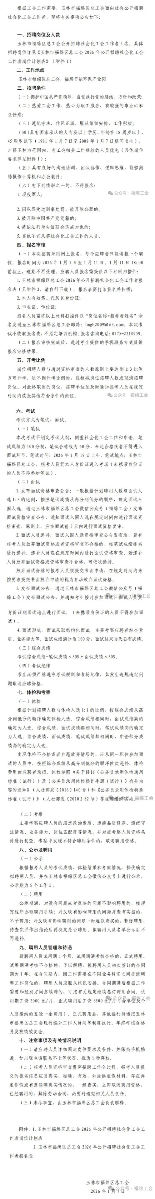 原文標(biāo)題:2026年玉林市福綿區(qū)總工會面向社會公開招聘社會化工會工作者的公告