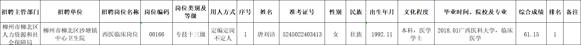 根據(jù)《柳州市2025年度下半年事業(yè)單位公開考試招聘工作人員公告》要求及安排,唐劉潔同志經(jīng)面試、考察、體檢合格,符合聘用條件。經(jīng)研究決定,擬聘用唐劉潔同志為我區(qū)事業(yè)單位工作人員,現(xiàn)予以公示,公示期為5個工作日(2026年1月22日至2026年1月28日)。對擬聘用的同志如有異議,請以書面形式,并署真實姓名和聯(lián)系地址,于2026年1月28日前郵寄或直接送我單位(地址:柳州市柳北區(qū)鷓鴣江六隊南200米(北外環(huán)路南)柳北區(qū)衛(wèi)生健康局512室;郵編:545002,電話0772-2802642),群眾如實反映有關(guān)問題受法律保護(hù)。